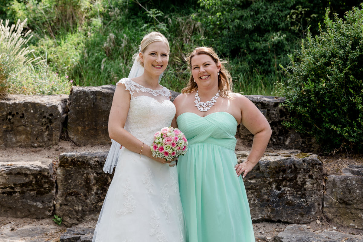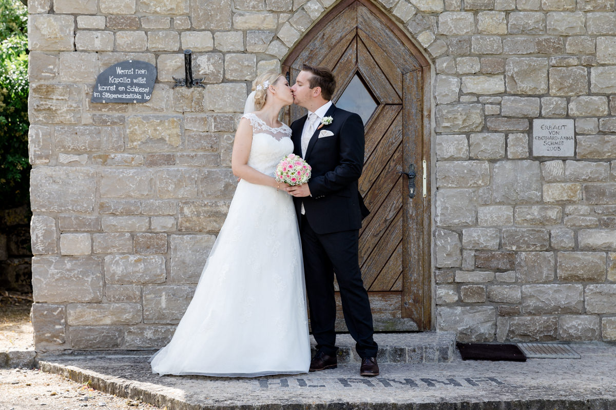 Zuerst fahren wir kreuz und quer durch Felder zu einem Aussichtspunkt, nicht unweit von Falkenstein und Donnersdorf gelegen. Man hat von der Kapelle Sant Anna am Fuße der Weinberge einen traumhaften Ausblick in das Steigerwaldvorland und das Maintal. Unsere Brautleute haben ihre 3 Trauzeugen mitgebracht und alle Hände werden gebraucht, um Janine sicher zur Kapelle zu geleiten. Die Wege sind schmal und mit Rosen verwachsen, doch ein herzallerliebstes Plätzchen für die ersten Hochzeitsbilder offenbart sich uns hier.