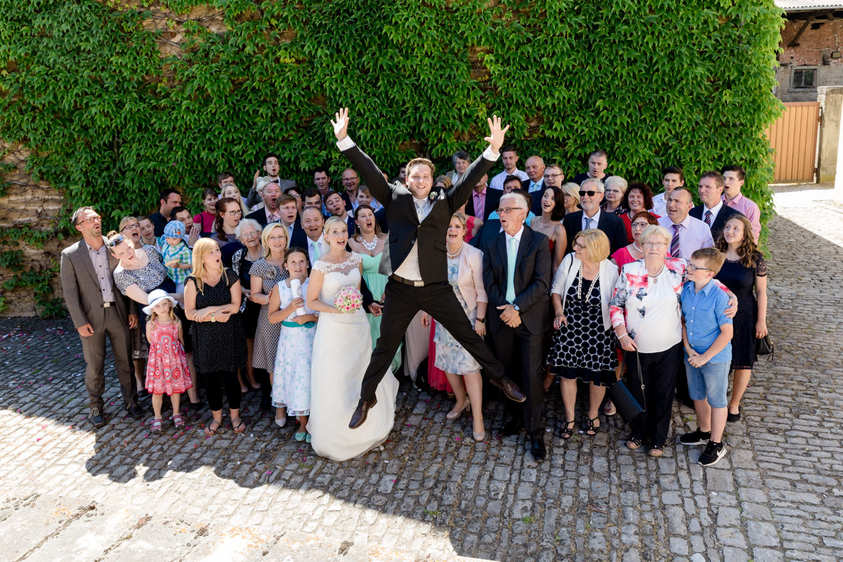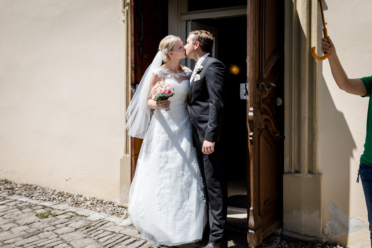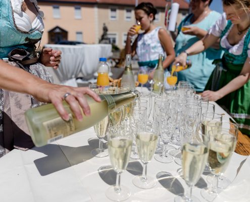 An der Stadtmauer in Gerolzhofen wird es dann langsam ruhiger um uns herum. Wir können alle durchatmen und nutzen noch eine kleine Pause, um vor der Trauung die letzten Handgriffe zu erledigen. Das Brautpaar huscht ganz schnell nach Hause und wir kümmern uns derweil um die Ringbilder. Uns bleibt nicht viel Zeit, denn unser Plan geht sofort weiter. Wir machen die ersten Aufnahmen in der Festscheune, wo anschließend gefeiert wird und sind dann auch die Ersten in der Kirche. Kurzer Lichttest, alles prima, es kann also losgehen.